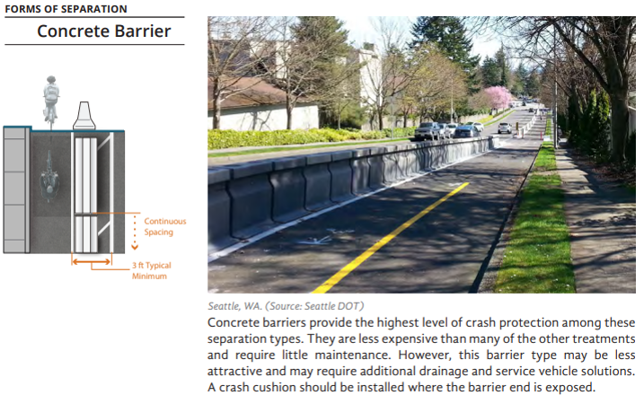 A concrete barrier may be the most protective barrier, but many do not like their aesthetics (Figs. 21-23). It also makes merging into the travel lane to make a left turn difficult for a someone in the cycle track. Still, creative paint or design could make these a possibility for Hillcrest. As noted in the FHWA description, these would only be possible (spatially) with a two-way cycle track.