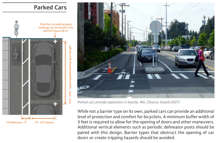 Figure 1. Description of a parking stop and delineator physical protection from FHWA.