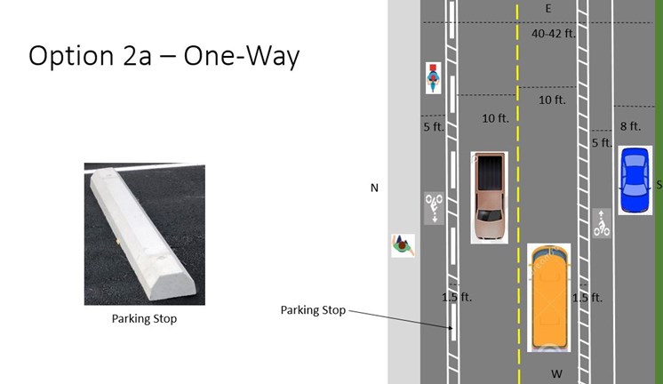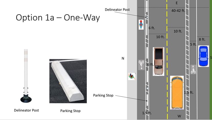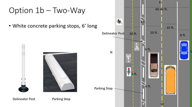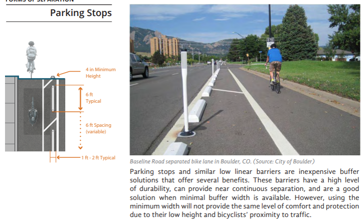 This is the option originally proposed by the City. The parking stops provide a reasonable physical separation between cars and bikes and the flexible delineators provide a vertical element, both clarifying to drivers that their is a physical obstruction in the roadway and creating a more comfortable separated space for cyclists (Figs. 1-5). We have the necessary funding to install this now.