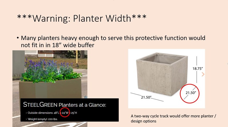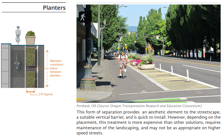 Figure 17. Planters heavy enough to serve a protective function will often be wider than 18 inches (the width of the buffer in a one-way protected bike lane on Kavanaugh).