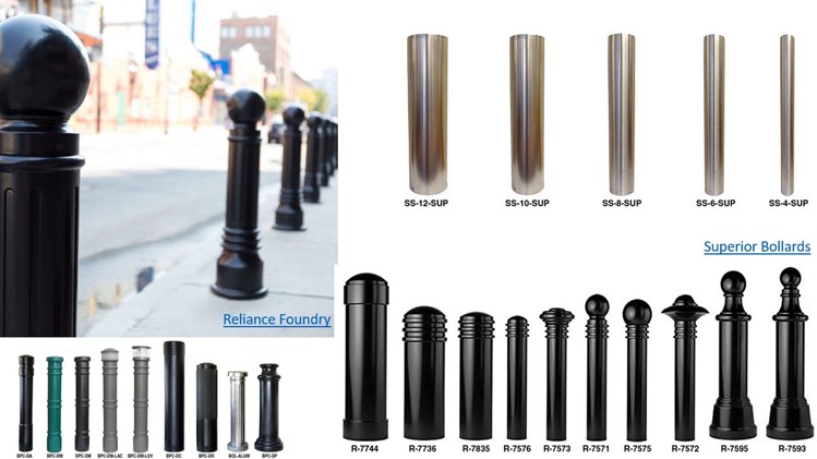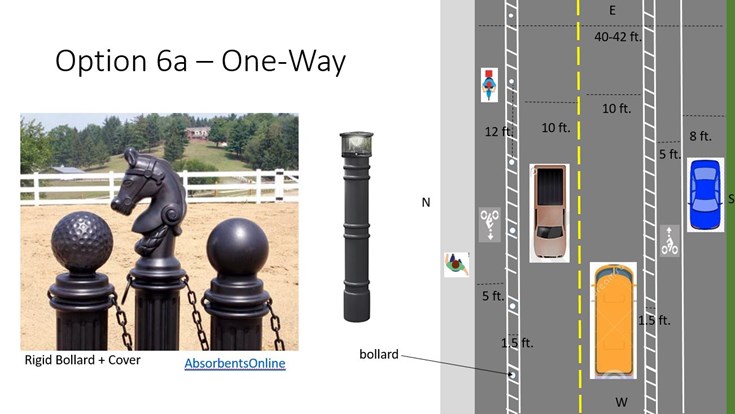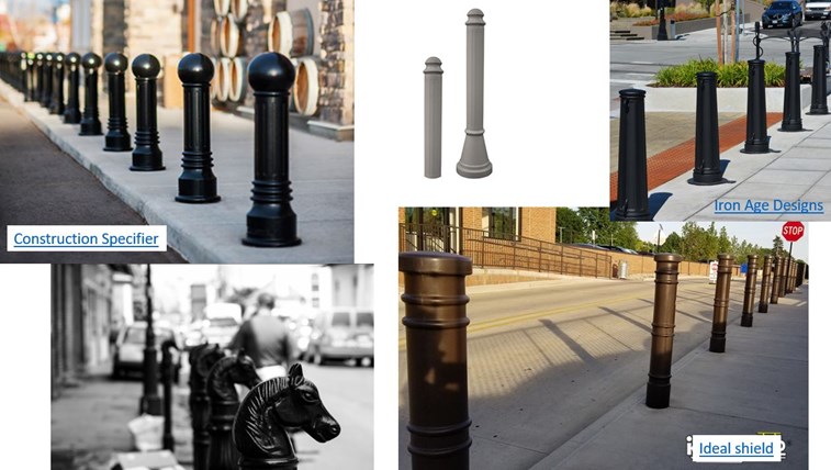 The HRA was clear about not liking the aesthetics of delineators. Rigid bollards are different than delineators; their aesthetic appeal to the HRA may or may not be different from delineators (Figs. 25-31). Like delineators, linear bollards are shaped like posts. Like delineators, they don’t have a wide footprint in the roadway and would be a good fit (spatially) in the 1.5 ft. buffer of a one-way bike lane on Kavanaugh. Unlike delineators, bollards are rigid and would provide an element of physical protection for the bicycle lane (while also providing that important vertical element). Linear bollards can be fitted with decorative bollard covers. Some of these bollard covers can be lit with a light that is charged with a solar panel during the day. Bollards are expensive, so getting a one-way bike lane with bollards funded by a granting agency while the other direction of bicycle traffic is not protected at all may be a challenge (see also “One-Way vs. Two-Way Bicycle Facility” above).