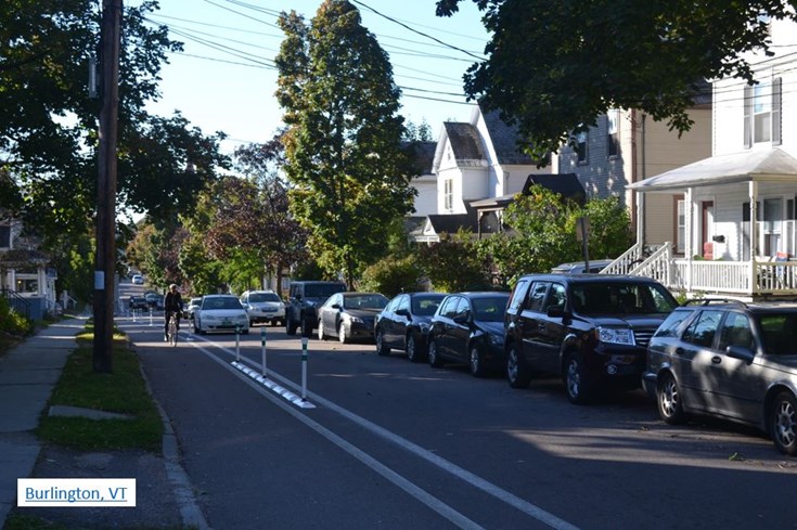 Figure 5. Example of a bicycle lane protected by stops and delineators in a historic residential neighborhood.