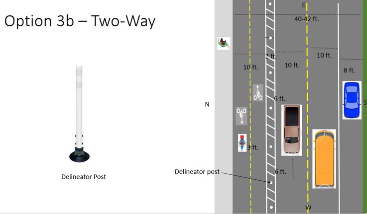 This is the similar to the option originally proposed by the City, but without the parking stops (Figs. 9-13). While the delineators would provide a vertical element and a visual separation between cars and bikes, these flex posts do not physically protect someone on a bike from a car entering the bike lane. This facility type is very common, perhaps the most common “protected” bike lane, not because it is particularly protective, but because it is inexpensive and checks the box of a protected bike lane. We have the necessary funding to install this now.