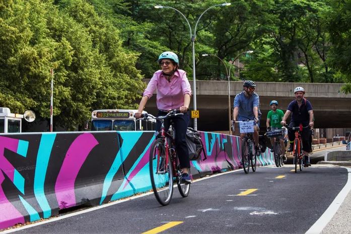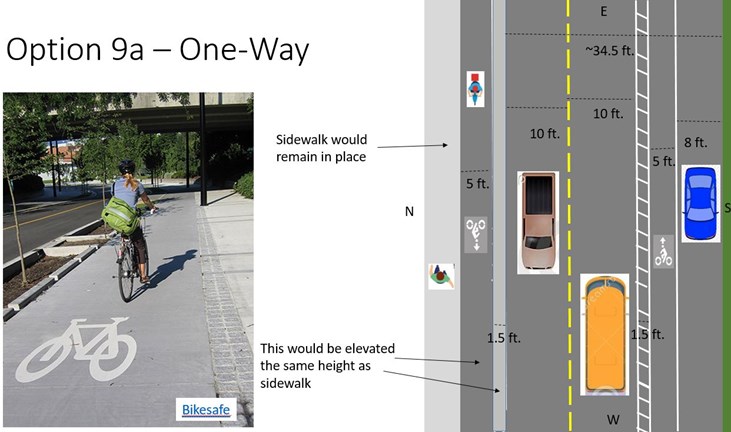 Technically, a sidepath is no longer a bike lane. It’s a shared-use path for people walking and biking, but one that travels along a roadway. The advantage of this facility over a raised median or raised lane is that we could go beyond the existing curb and claim the area currently used by the sidewalk. This would create a brand new pedestrian facility as well, in good repair for strollers, wagons, and wheelchairs, and also create additional width that could be used for aesthetic landscaping without going any further away from the roadway than the existing sidewalk.