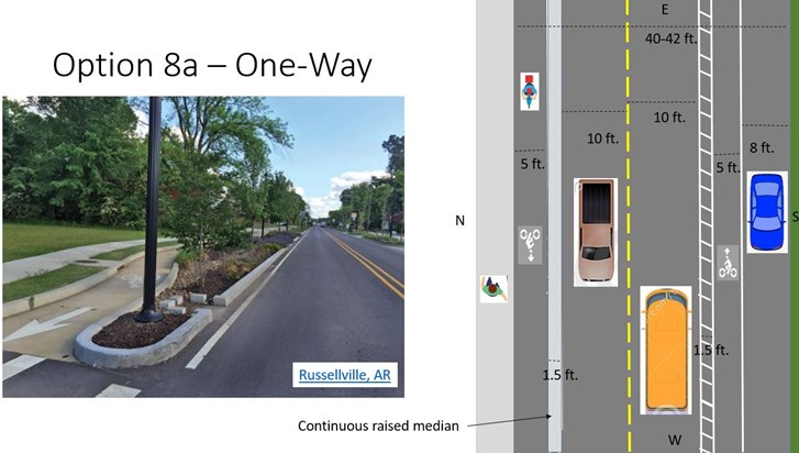 This is similar to a raised median, but the cycle track is not at the same height as the roadway. The facility would probably be a poor fit for a one-way cycle track on Kavanaugh (buffer is not as wide as FHWA minimum recommended width and does not protect person on bike going in the other direction).