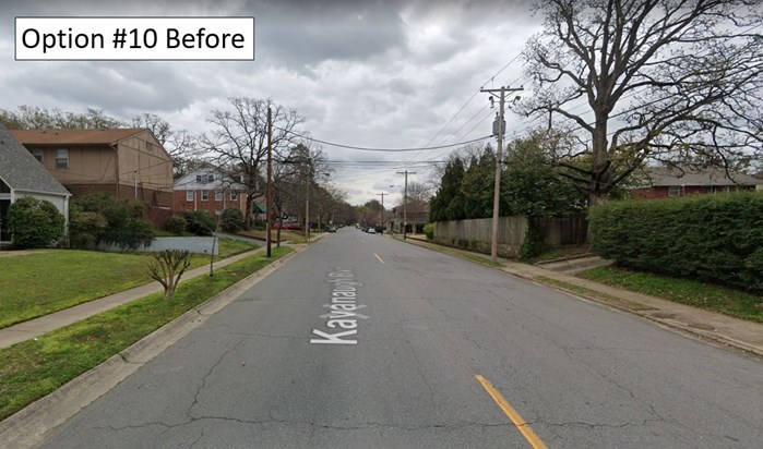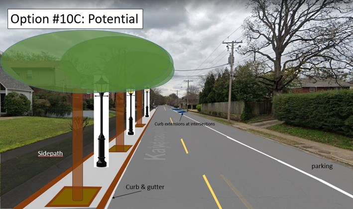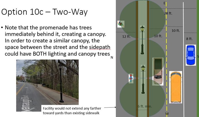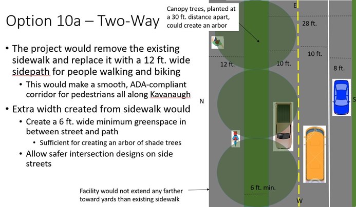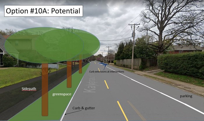 Figure 46. Even though Option 10b above might look most like the promenade, notice how the tree canopy from Allsopp Park frames the promenade. This continuous tree canopy wouldn’t be extended along Kavanaugh from front lawns. Option 10c might serve maintaining this arbor aesthetic best. ***A sidepath is a bicycle AND PEDESTRIAN facility***