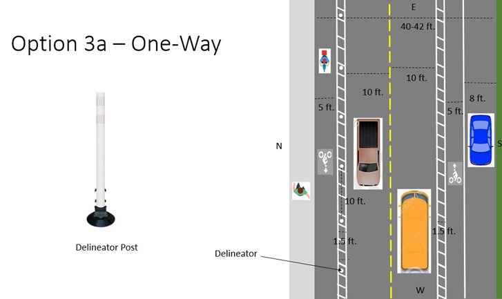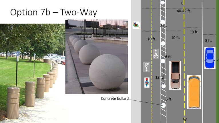 Figure 32. Aerial concept of a one-way bike lane protected by concrete bollards.