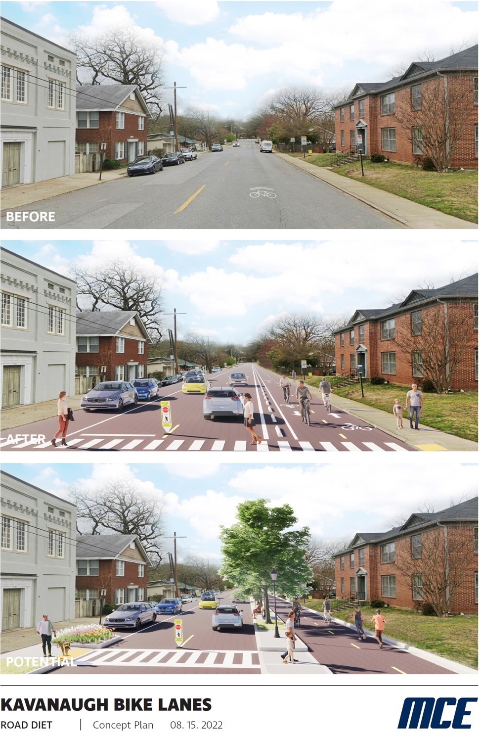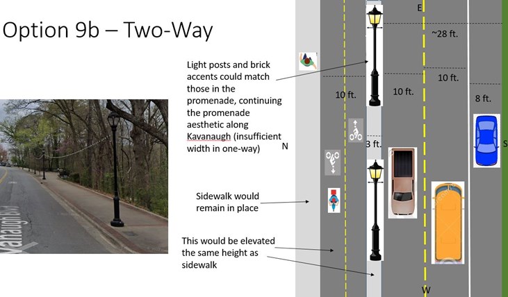 Figure 51. It turns out the folks at McClelland Engineering are much better at graphic design than I am. This gives you a better idea of what Kavanaugh could look like with a sidepath and curb extensions. Note that the sidepath’s depicted dashed yellow line is fine but is not necessary, the sidepath could be made of asphalt (depicted) or concrete to better match the promenade, and could be raised to curb height (more like a “raised lane”) vs. what is depicted (more like a “raised median”).