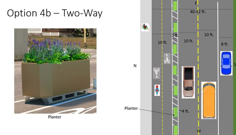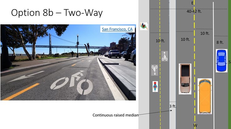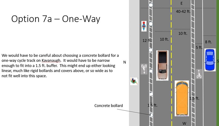 Why consider this now? It may be best to consider a phased approach, installing one of the three options for which we have funds that must be used now and then seek funding to construct the HRA’s preferred option in an upcoming grant cycle. Funds for the HRA’s preferred facility would actually be much easier to secure if we followed this phased approach, because the granting agency would see that the proposed traffic pattern works, it is safe, feels safe for all users, and the City has community buy-in (like a pop up does). But we would only have these benefits if the traffic pattern of Phase One approximated the traffic pattern we intend to create in the grant. It would also further incentivize the City to secure funding for this optimally aesthetic facility in the near future in order to make crossings of the two-way facility safer. In short, City staff recommends inexpensive one-way bike lanes, BUT if the HRA wants to create a more expensive bicycle facility on Kavanaugh for aesthetic purposes, it may be best to start with a two-way cycle track on the north side of Kavanaugh.