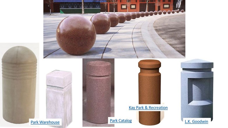 Concrete bollards have a lot of the same properties as rigid linear bollards: they provide a physical barrier to a car entering the bike lane, they have a vertical element, and they are much more expensive than parking stops and/or delineators (Figs. 32-34). Some concrete bollards are shaped like posts, but are typically wider than rigid linear bollards. Some concrete bollards have other shapes, like spheres, and have an even wider profile. For these reasons, concrete bollards would not be a good fit for the 1.5 ft. buffer of a one-way cycle track spatially.