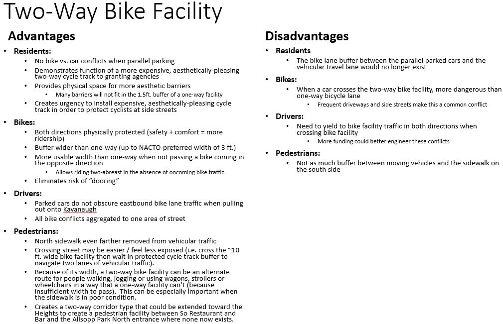 Table 1. Advantages and disadvantages of installing a two-way cycle track vs. City-proposed one-way facilities on Kavanaugh.