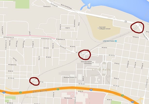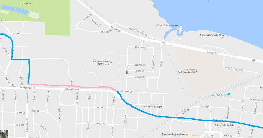 The connection from the the Markham BikePed Trail to Kavanaugh Blvd. is not yet fully developed conceptually, but may be Woodrow St. to Little St. to Kavanaugh Blvd. If completed, this could be an important piece to the puzzle of solving East-West connectivity for bicyclists between I-630 and the Arkansas River.