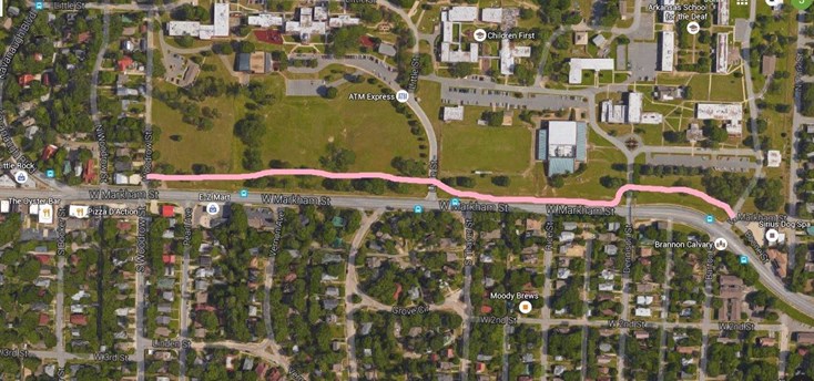 The Markham BikePed Trail would be built along the north side of Markham between Boone and Woodrow Streets (in front of Arkansas Schools for the Blind and Deaf, Fig. 1). More specific plans have been drafted for its specifications and path along this route, but these may change because the City is still working with landowners to obtain easements.