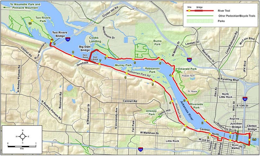 A strong connection between the Arkansas River Trail and the Southwest Trail will encourage local and regional cross-use of the trails as transportation corridors (Fig. 4). For the Southwest Trail, that would mean connecting to North Little Rock, West Little Rock, and downtown Little Rock/Rivermarket and all of their amenities. Among other benefits, a strong connection to the River Trail will allow Southwest Trail users to access restaurants, hotels, bike shops and just about any other resource they might want or need after their journey, all by bike.