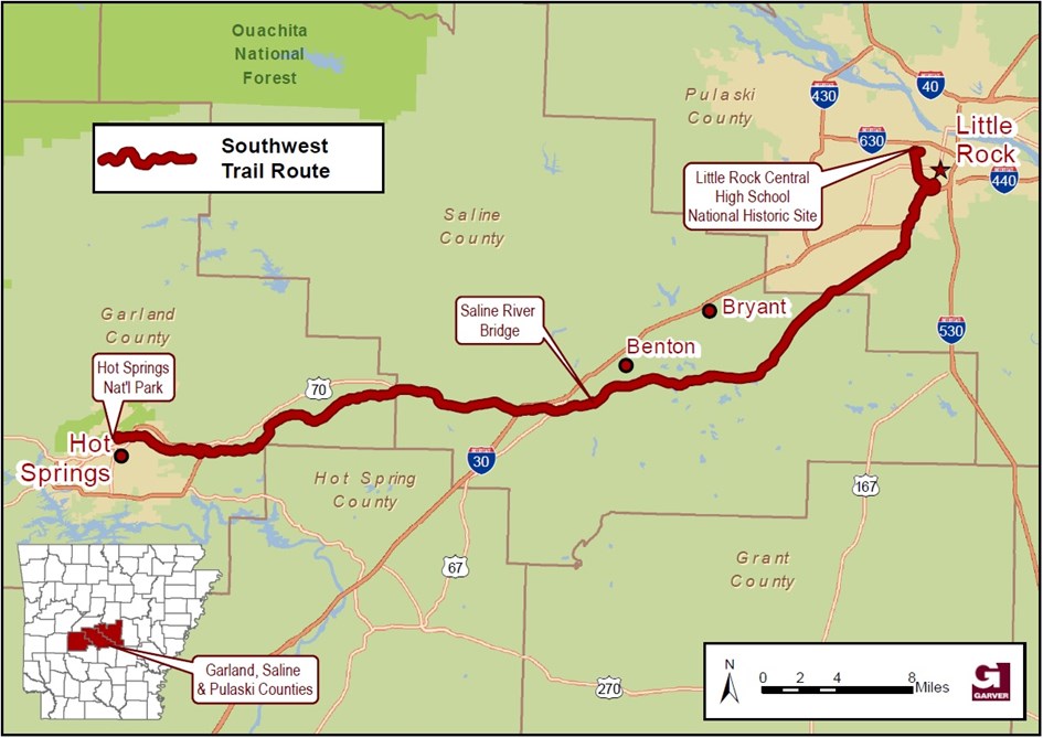 Figure 1. The proposed Southwest Trail route, anchored by Little Rock and Hot Springs, but connecting many communities in between. Map courtesy of Garver.