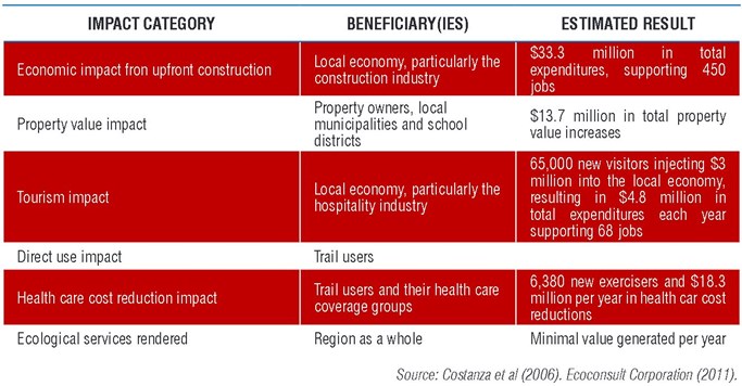 The Southwest Trail won’t simply bring the same benefits to a larger area, it will amplify them. The Southwest Trail will bring economic benefits from its construction (pg. 3-2), increasing property values along its length (pg. 3-2), and increasing tourism (approximately 1000 out-of-town tourists per mile per year!; pg. 3-3). It will increase community health and decrease healthcare expenses (pg. 3-4 & 3-5). The community health benefits alone will pay for the cost of the trail’s construction in less than two years, a projection supported by a recent economic impact study of the Razorback Greenway (Table 1)!