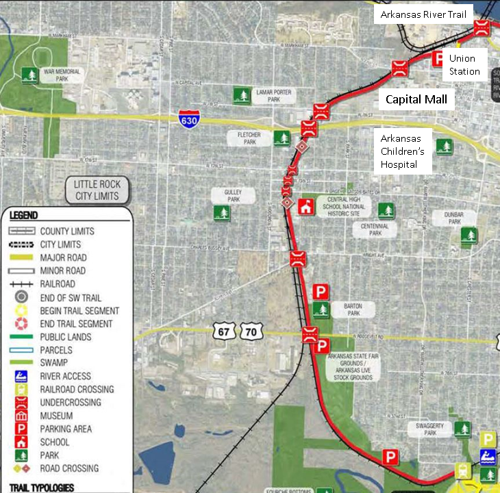 In addition to providing a regional recreation corridor with many economic benefits, segments of it will also provide local transportation benefits. This page will discuss these benefits in terms of Little Rock, but there will be local transportation benefits in every community the Southwest Trail touches.