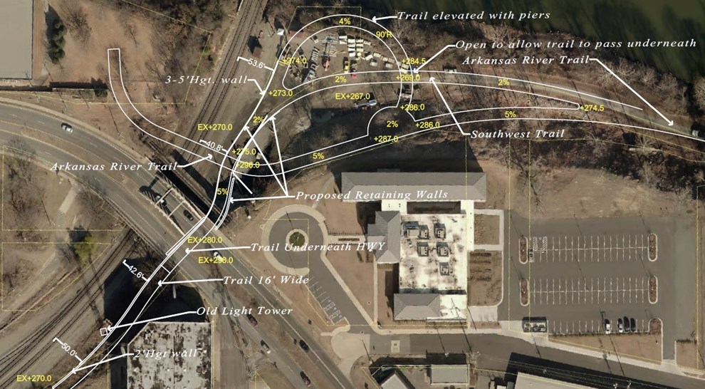 The majority of the Phase One funds will be spent stabilizing the Arkansas River bank that is falling into the river (Fig. 4: gray trail). The remaining funds will be used to create a ramp from the Medical Mile to the bridge currently being constructed over the Union Pacific tracks (pink). The green section is Phase Two. See also our application and supporting materials.