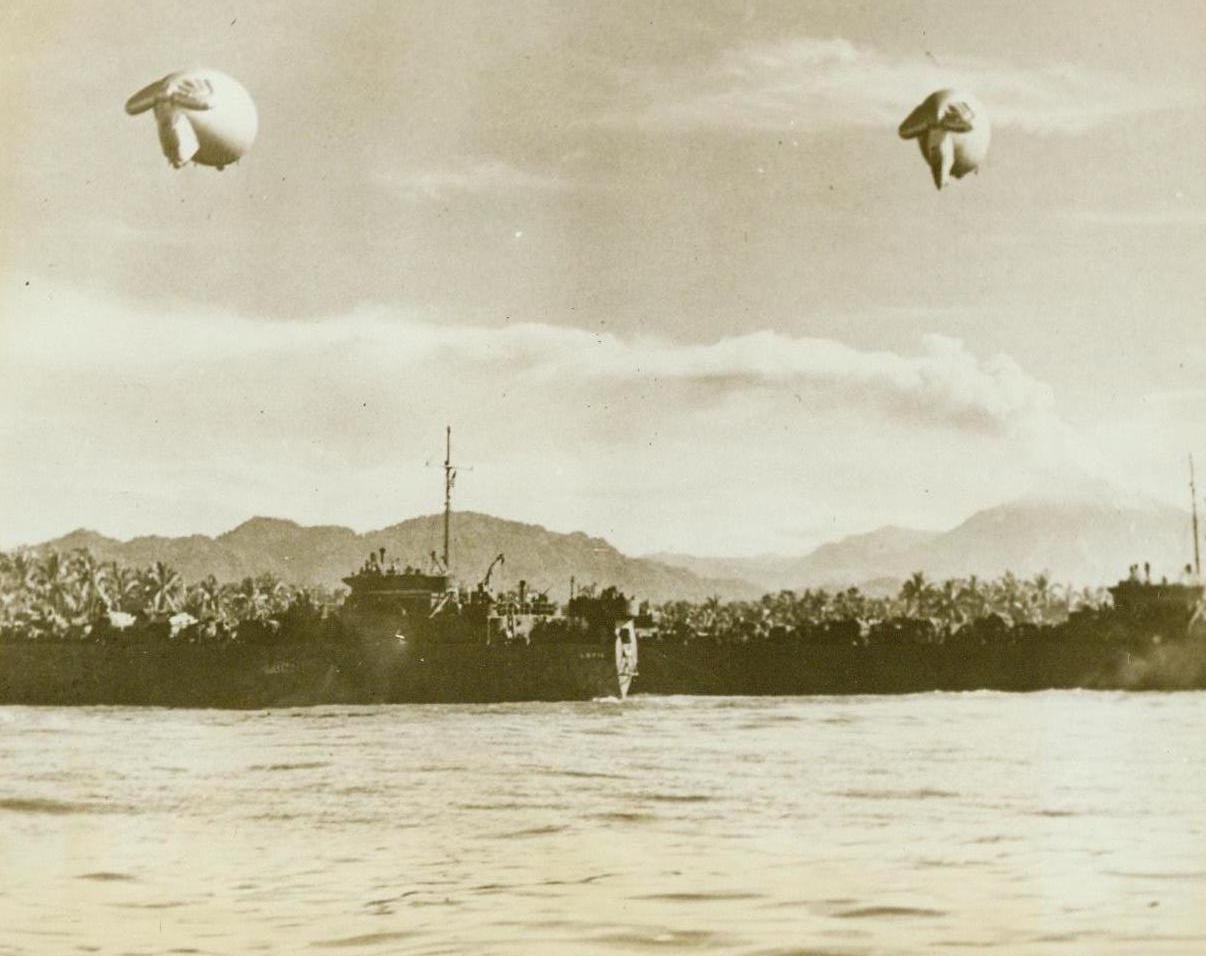 LST's Guardian Angels. Bougainville: Two barrage balloons dangle lazily in the air over several LST's unloading supplies for American forces, who have been pushing the Japs backwards into the jungle from the beachhead at Bougainville. The balloons keep Jap planes from making low-level air attacks. Far in the distance can be seen the smoking crater of Bagano, an active volcano on this spot. (ACME);
